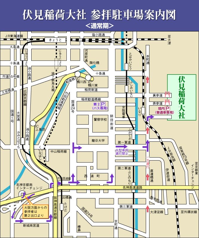 伏見稲荷大社には、無料の駐車場がありますが、土日祝日は大変混雑するため、公共の交通機関の利用がオススメです。年末年始は駐車場を閉鎖してます。